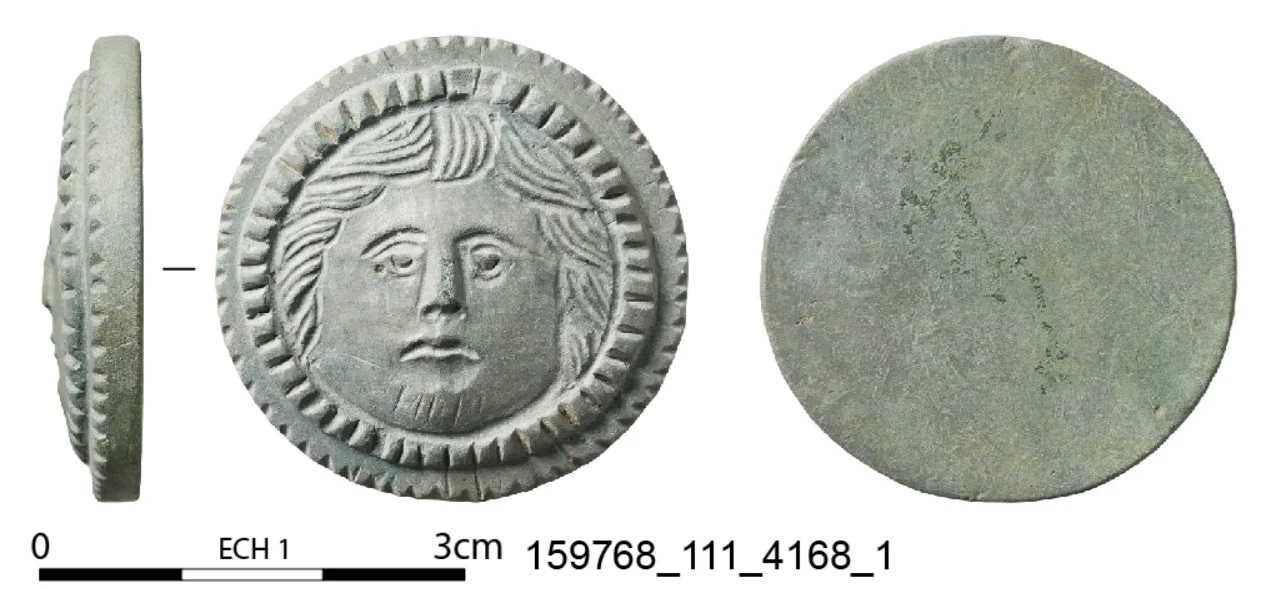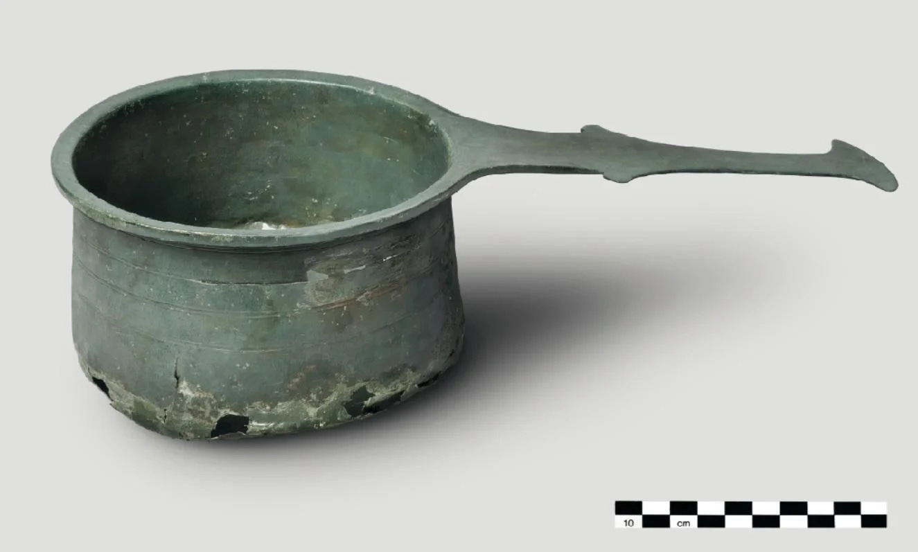Roman-era pits have produced a rich array of finds from the daily life of the inhabitants, including a piece of furniture appliqué with the head of Medusa or a Gorgon, coins, the possible remains of a farm cart, and a bronze cooking pot with lead repairs.