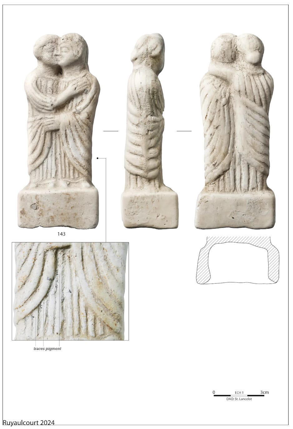 Areas for Gallo-Roman burials have also been located, producing wooden coffins, ceramics, a glass bead necklace, and a terracotta figurine of a pair of lovers.