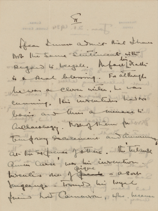 The letter, dated 21st January 1934 and written by Carter in Luxor, was sent to a Helen Ionides in thanks for Ionides’ sending of some recent newspaper obituaries.
